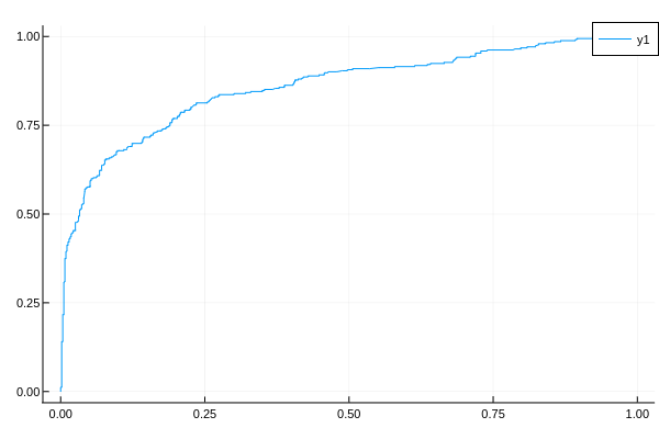 fprs, tprs, ts = roc_curve(ŷ, y) = roc(ŷ, y)如果我们的测试数据集类别分布大致均衡的时候我们可以用ROC曲线 给定基本事实y,两类概率预测ŷ,返回ROC曲线。ts返回阈值范围内的真阳性率,假阳性率 其中